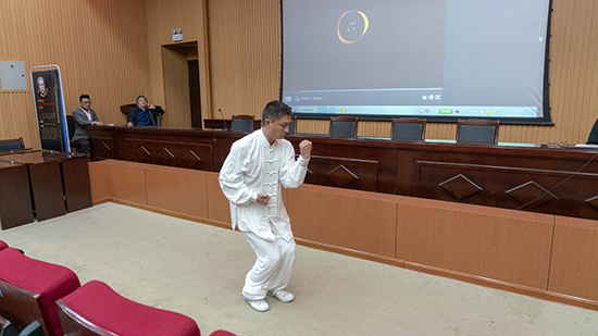 “慷慨倚长剑,高歌一送君”——从剑术、剑道、剑胆浅谈中国剑文化(陈万卿及苌家拳剑术演练团队):汇报可分为两部分内容,一是讲述,二是现场演练。剑术内涵丰富,不仅是一种技击的军事技能,也是刚柔并济的武术门类,更是一种陶冶情操的艺术形式;剑道偏向于精神世界的终极思考,是剑术在哲学世界抽象体现;剑胆是对亮剑精神的诠释,代表着中华传统文化体系的强悍与勇武。剑术、剑道、剑胆构成了博大精深的中国剑文化,体现了“穷则独善其身,达则兼济天下”的理想境界,蕴涵着正义必胜的道德期待与浪漫优雅的武术审美。